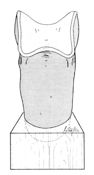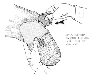 Before applying the resin, the stump outlines are palpated once again. For a good result the following areas should, be noted: - bony contour of patella, - bony distal edge of patella, - the tendon of patella (see drawing), - bony contour of tibial head, - bony contour of tibial crest, - medial bony surface of tibia, - bony small head of fibula, - muscular surface, lateral to tibial crest, - compressibility of calf muscle, - popliteal flexor tendons, - concave curvature of popliteal area. Test application of moulding tool. It has two moulding sides, one of which should fit. But this must be checked and, if necessary the tool re-adjusted. Please note.- All items mentioned above will be considered later on during socket manufacture in order to achieve a good functional result.