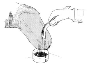Turn over PVA sleeve brim so that it cannot be torn, fill with resin mixture. The sleeve is kept in the illustrated position until the air enclosures (larger air bubbles) have escaped. Please note: Is the relation resin:,hardener correct? Do not throw away the mixture cup for resin, it will still be needed.