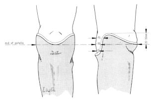 Fig. 46: Anterior and lateral view of trim linesThis diagram shows the position of the cut edge of the socket brim from both an anterior and, a lateral view. The patella is covered between 1/3 to 1/2 of its height. Laterally, the socket brim from about 20-30 mm (according to size of patient) above the mid patella at a position of about 2/3 of the lateral leg width. Then, slightly slanting, it runs relatively steeply down, posteriorly. The measurements given are approximate only. The brim slope is specific to each patient, and differs individually.