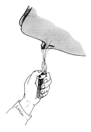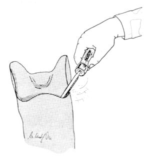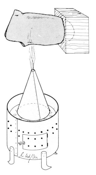 Fig. 55: Heating socket for correction purposesIt is not possible to functionally modify the D.S.L.T. socket to such a degree as would have been the case with a positive p.o.p. model. Alteration in shape or volume, though, may be carried out to a possibly required extent, without real difficulties. With a cone-shaped metal nozzle turned upside down and put on a charcoal fire (e.g. a petrol funnel), certain parts of the socket may be point heated in order to re-mould these parts thermoplastically.