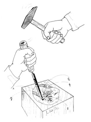 Fig. 50: Preparation of block from light woodFor fitting and for subsequent processing, the socket is inserted into a block of light wood, inserting it to a depth of about 40 mm (1.5 inches). It is glued with a mixture of resin and sawdust. Please note: The wood fibres run in vertical direction. This time, the resin should be prepared with normal hardener amount. Position and arrangement of socket can be seen in Figures 51-53,