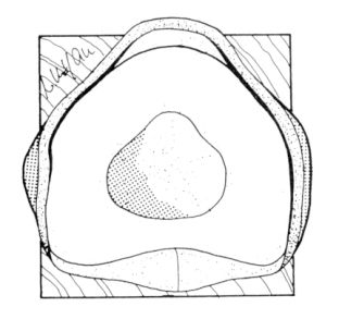 Fig. 54: The result - view into the socketLooking from above into the socket, a cross section of a triangle with almost equally long sides is to be seen. One side forms the, anterior, medial tibial edge, the next stands for the anterior lateral muscle surface, and the third side for the flattened calf. This functional shaping prevents rotations of the prosthesis around the stump and simultaneously corresponds to the anatomical bio-mechanical requirement of the BK stump.