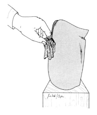 After application of the alternative procedure in Figure 44, the resin is massaged by means of a metal spatula into the material in order to ensure its thorough distribution through it. Simultaneously, the resin surplus is pressed out again. The surplus resin should be collected in the mixing cup which must be held underneath. Please note: if a PVA outer sleeve is not available, the functional moulding procedures presented in Figure 43 will be difficult or made impossible. The functional moulding corrections must then be performed later, which is much more difficult, and imprecise in its result.